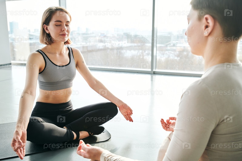 Две молодые спокойные женщины в спортивной одежде, сидящие на матрасах в позе лотоса