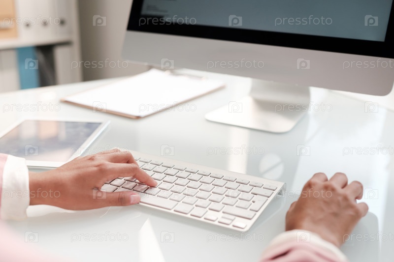 Руки молодой современной бизнес-жены, держащей пальцы на кнопках клавиатуры