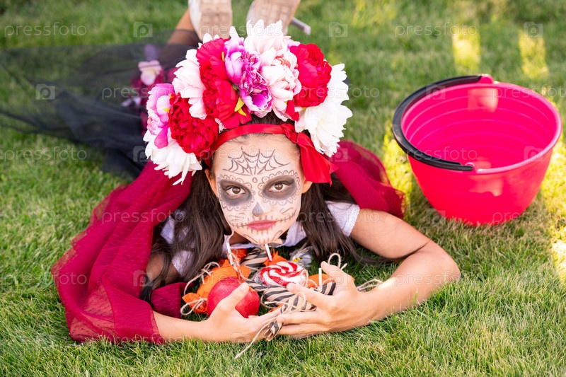 Милая девушка с покрашенным лицом держит кучу сладких лакомств Хэллоуина на зеленой лужайке