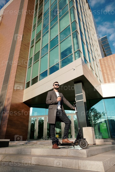 Элегантный бизнесмен пьет кофе, сохраняя одну ногу на электрическом скутере