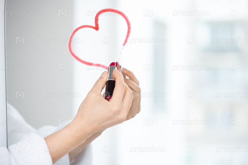 Рука флиртующей женщины в белом халате, рисующая сердце с пурпурной помадой