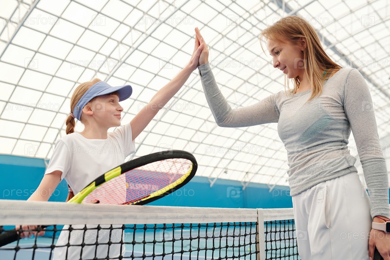 Девушка в спортивной одежде держит теннисную ракетку, давая пять своим тренерам