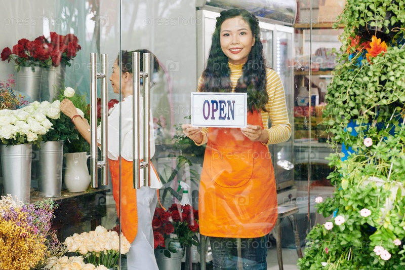 Цветочник наклеивает открытый знак