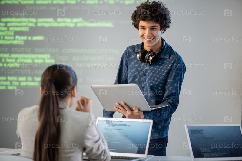 Счастливый молодой студент с ноутбуком смотрит на своего одноклассника перед собой