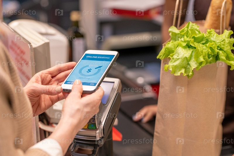 Руки современного зрелого клиента со смартфоном над платежным автоматом