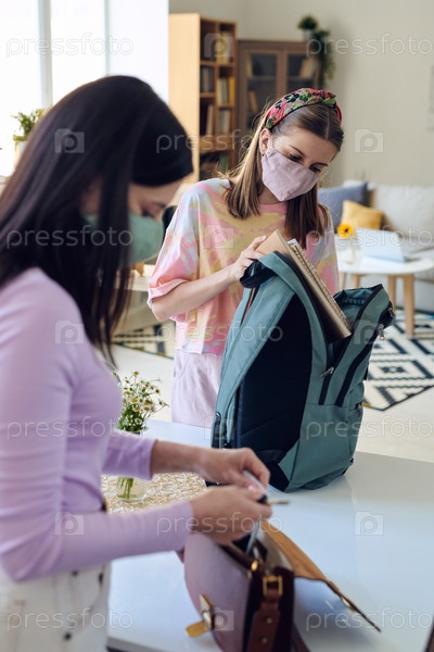 Современная школьница-подросток в защитной маске кладет книги в рюкзак