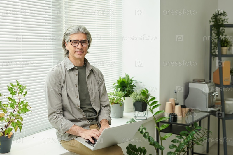 Портрет контента седой маркетолог, сидящий на подоконнике с домашними растениями и использующий ноутбук во время планирования рекламной кампании
