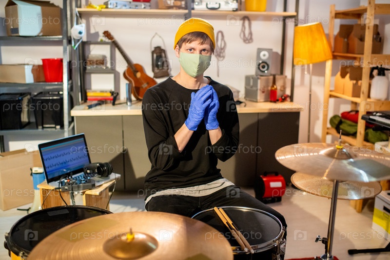 Современный музыкант в защитных перчатках и маске сидит перед барабанщиком