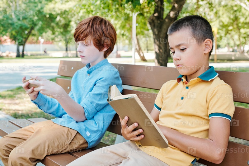 Любопытные мальчики читают на свежем воздухе