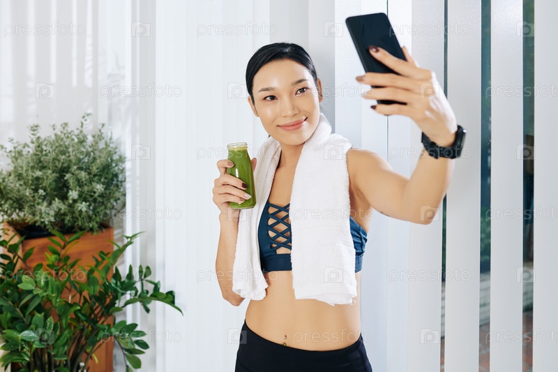 Женщина фотографирует с зеленым смузи
