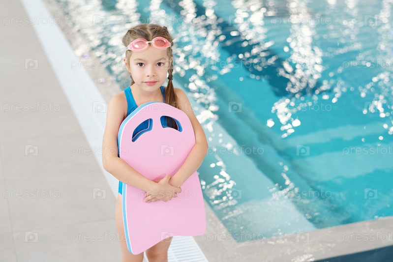 Очаровательная девочка в купальнике и очках стоит напротив бассейна