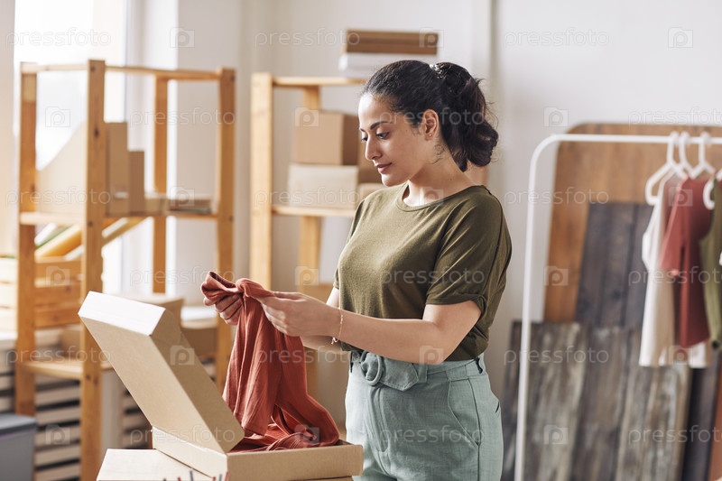 Женщина упаковывает одежду в веб-магазине