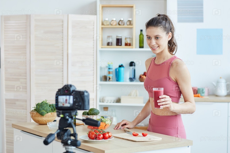 Спортивная женщина записывает видео на кухне
