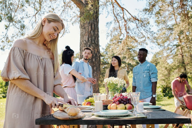 Счастливая молодая блондинка режет свежий багет на деревянной доске у стола
