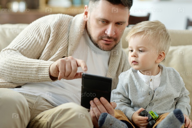 Отец с сыном, использующим устройство на диване