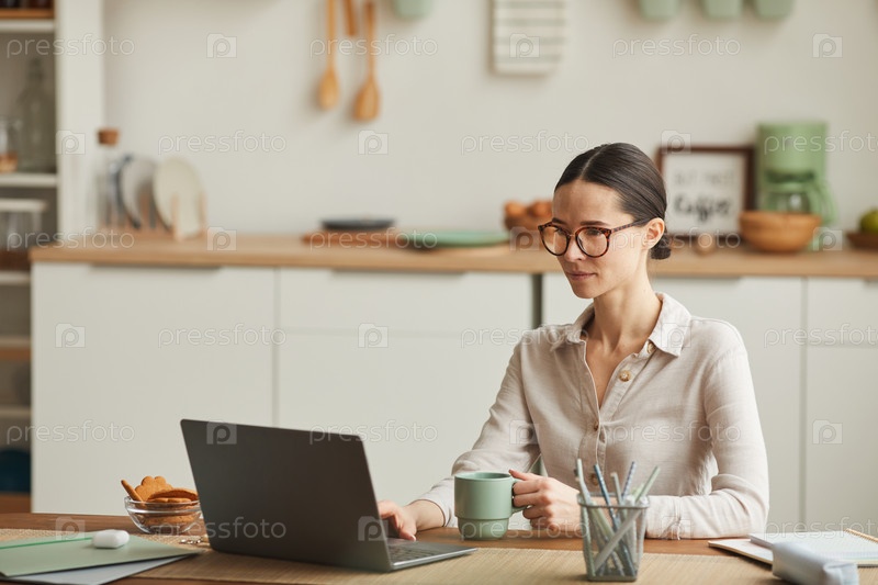 Элегантная женщина работает за кухонным столом