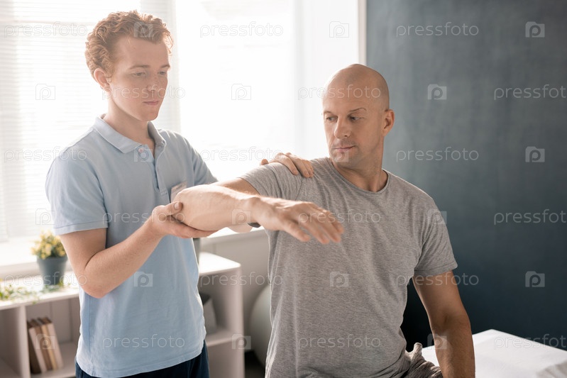 Физиотерапевт поддерживает руку пациента в локте, консультируя и помогая ему