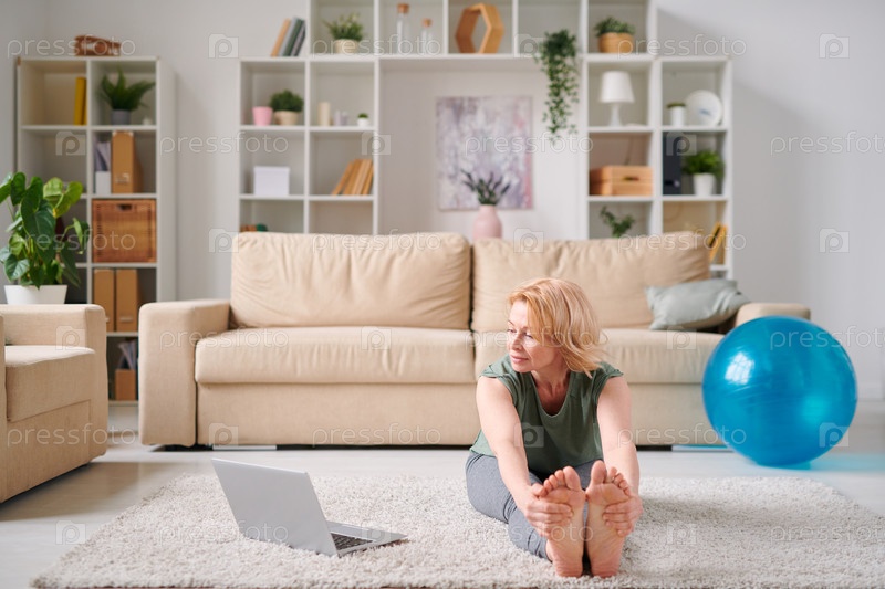 Зрелая активная женщина в спортивной одежде, занимающаяся на полу перед ноутбуком