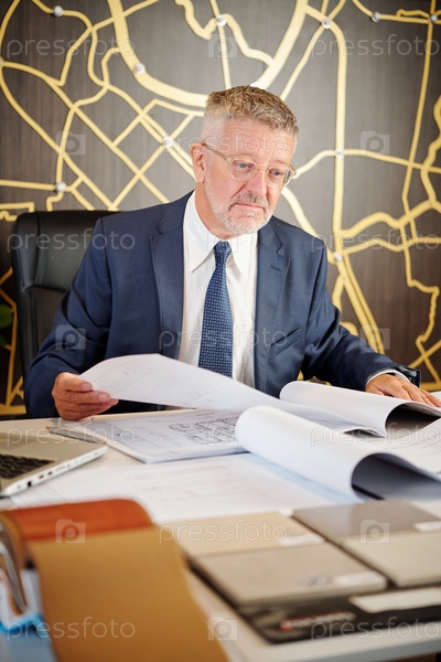 Зрелый мужчина проверяет строительные планы
