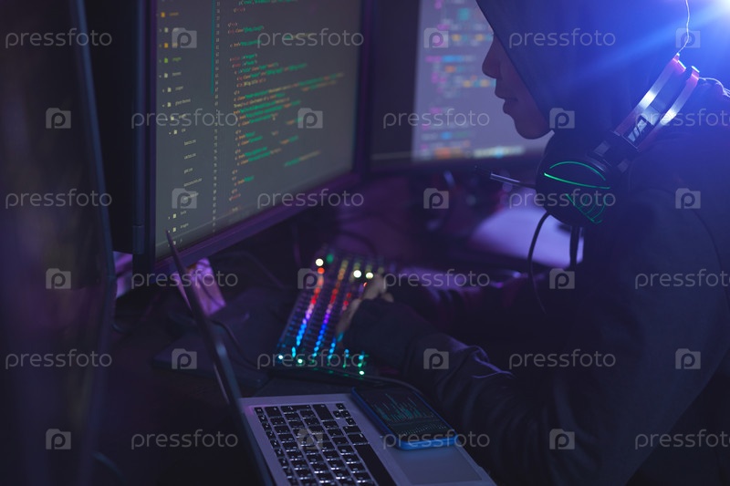 Человек с капюшоном кодирует в темноте
