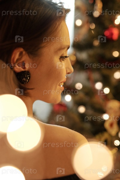 Задний вид молодой счастливой элегантной брюнетки с великолепными серьгами