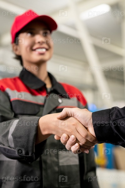 Рука успешной женщины-инженера в области рабочей одежды приветствует коллегу или бригадира