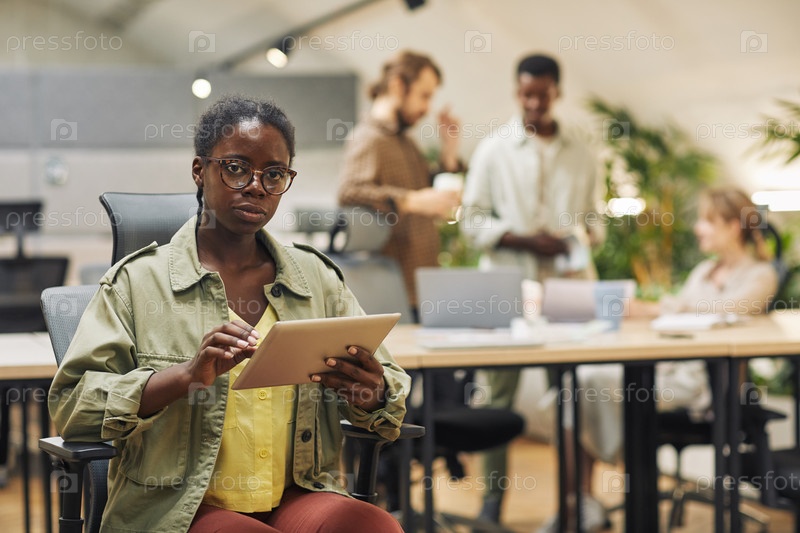 Афроамериканская женщина позирует с планшетом в офисе