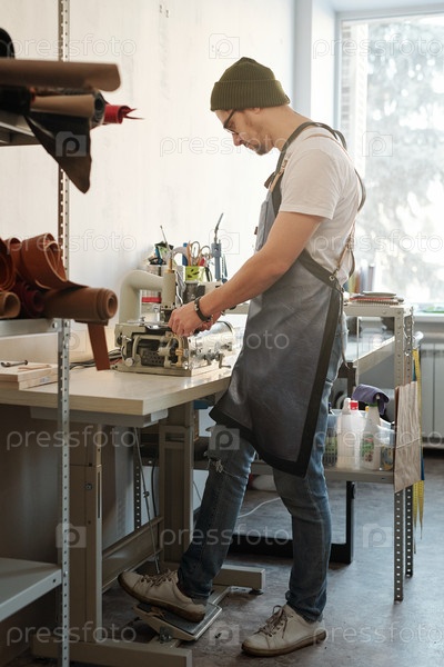 Молодой человек в рабочей одежде стоит за столом с одной ногой на педали во время работы