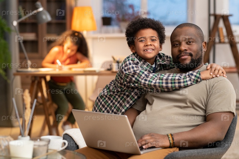 Милый ласковый маленький сын обнимает отца, сидящего в кресле и общаясь с другими людьми