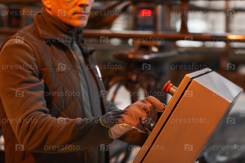 Работник, работающий с машинами на фабрике Close Up