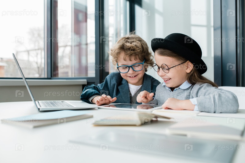 Два веселых школьника с цифровым планшетом просматривают информацию в Интернете