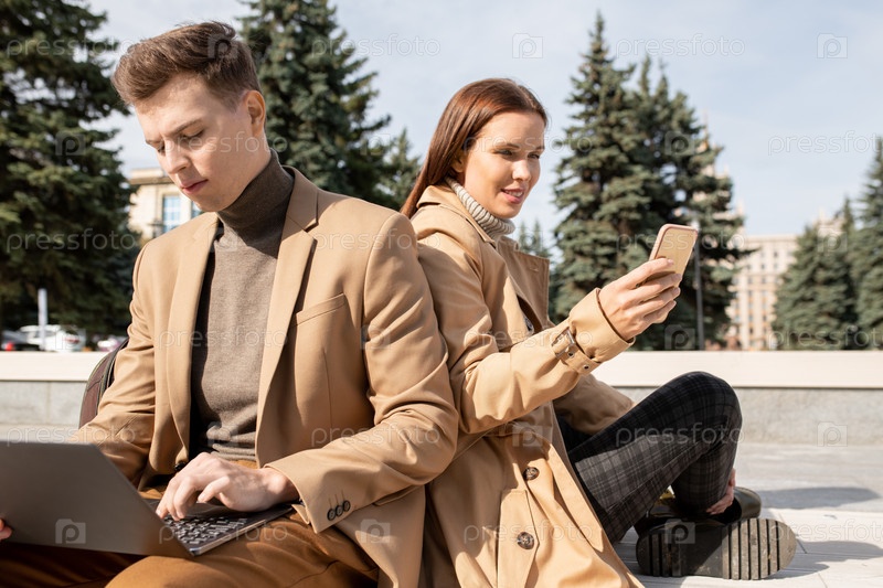 Молодые миллениалы в элегантных плащох, пуловерах и брюках используют гаджеты