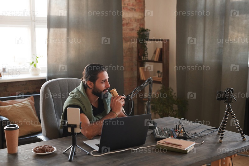 Горизонтальный снимок красивого мужчины с Ближнего Востока, сидящего за столом перед ноутбуком и устанавливающего микрофон для начала онлайн-трансляции