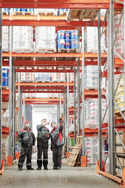 Группа складских рабочих в перчатках, респираторах и рабочей одежде обсуждает товары
