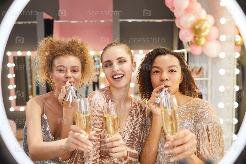 Красивые молодые женщины позируют для фото на вечеринке