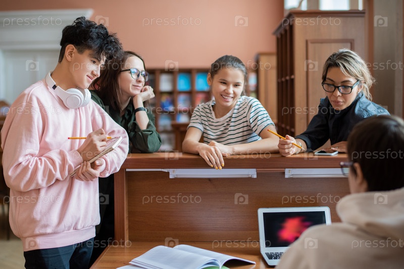 Группа умных студентов колледжа, стоящих рядом с программистом перед ноутбуком