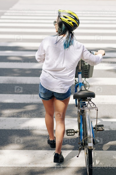 Женщина-велосипедистка пересекает дорогу
