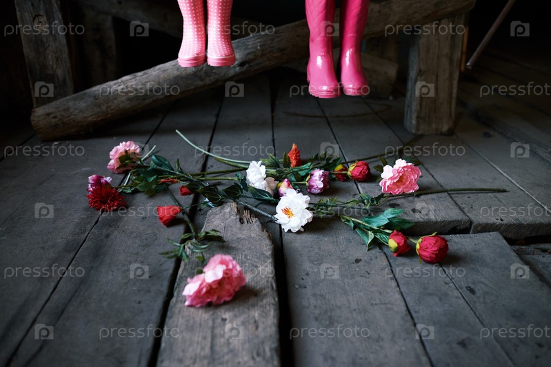 Две пары розовых стильных резиновых сапог передают деревянный пол и цветы