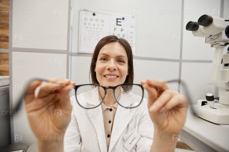 Улыбающийся женский офтальмолог, держащий очки POV