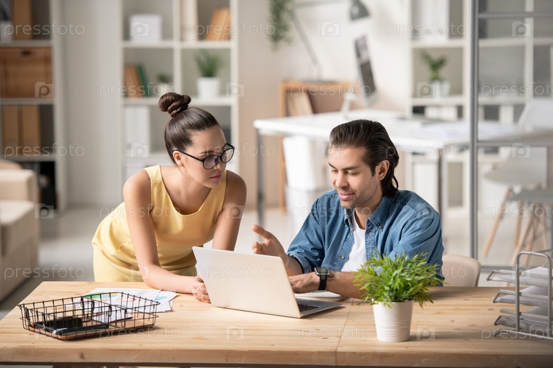 Один из двух молодых брокеров объясняет своему коллеге онлайн финансовые данные