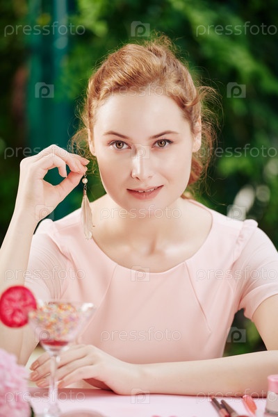 Женщина показывает свои серьги