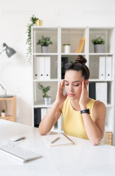Молодая серьезная бизнес-леди пытается сконцентрироваться и трогает свои храмы