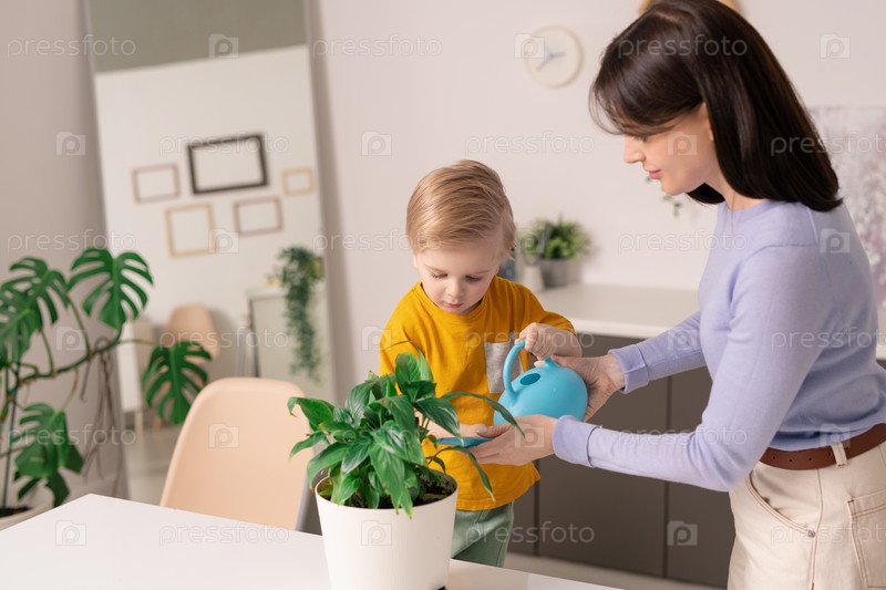 Милый маленький ребенок помогает матери поливать зеленую домашнюю растительность