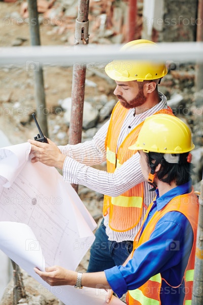 Строители проверяют чертежи домов
