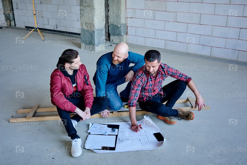 Счастливые молодые инженеры сидят внутри незавершенного здания и обсуждают эскиз