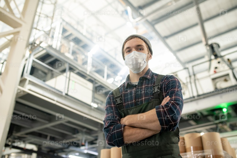 Молодой серьезный мужской работник большой фабрики в рабочей одежде и защитной маске