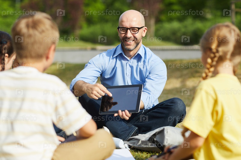Улыбающийся учитель-мужчина указывает на планшет в открытом воздухе