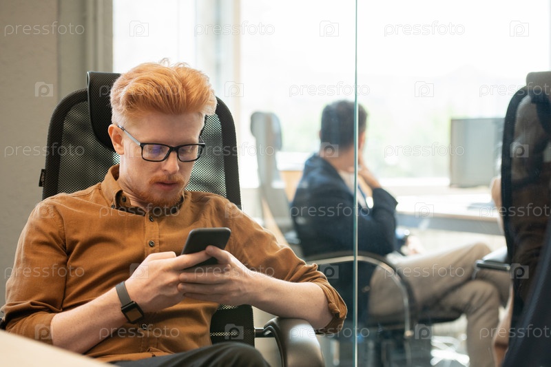 Молодой элегантный бизнесмен в очках, прокручивающий смартфон или отправляющий смс