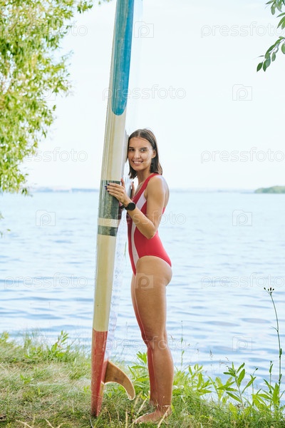 Молодая веселая брюнетка в красном купальном костюме стоит у воды с доской для серфинга