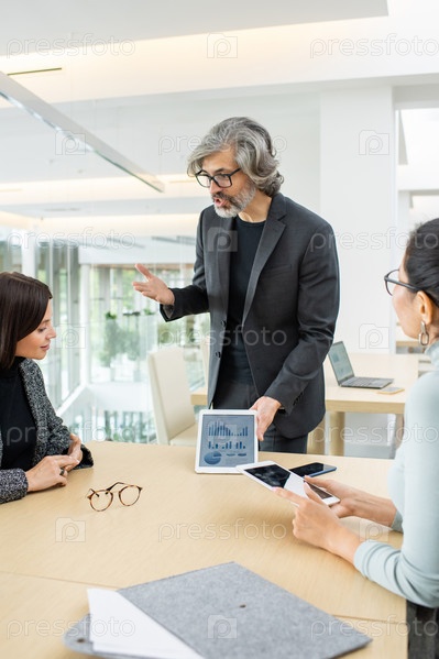 Уверенный зрелый экономист-мужчина с сенсорной панелью объясняет женщинам финансовые данные